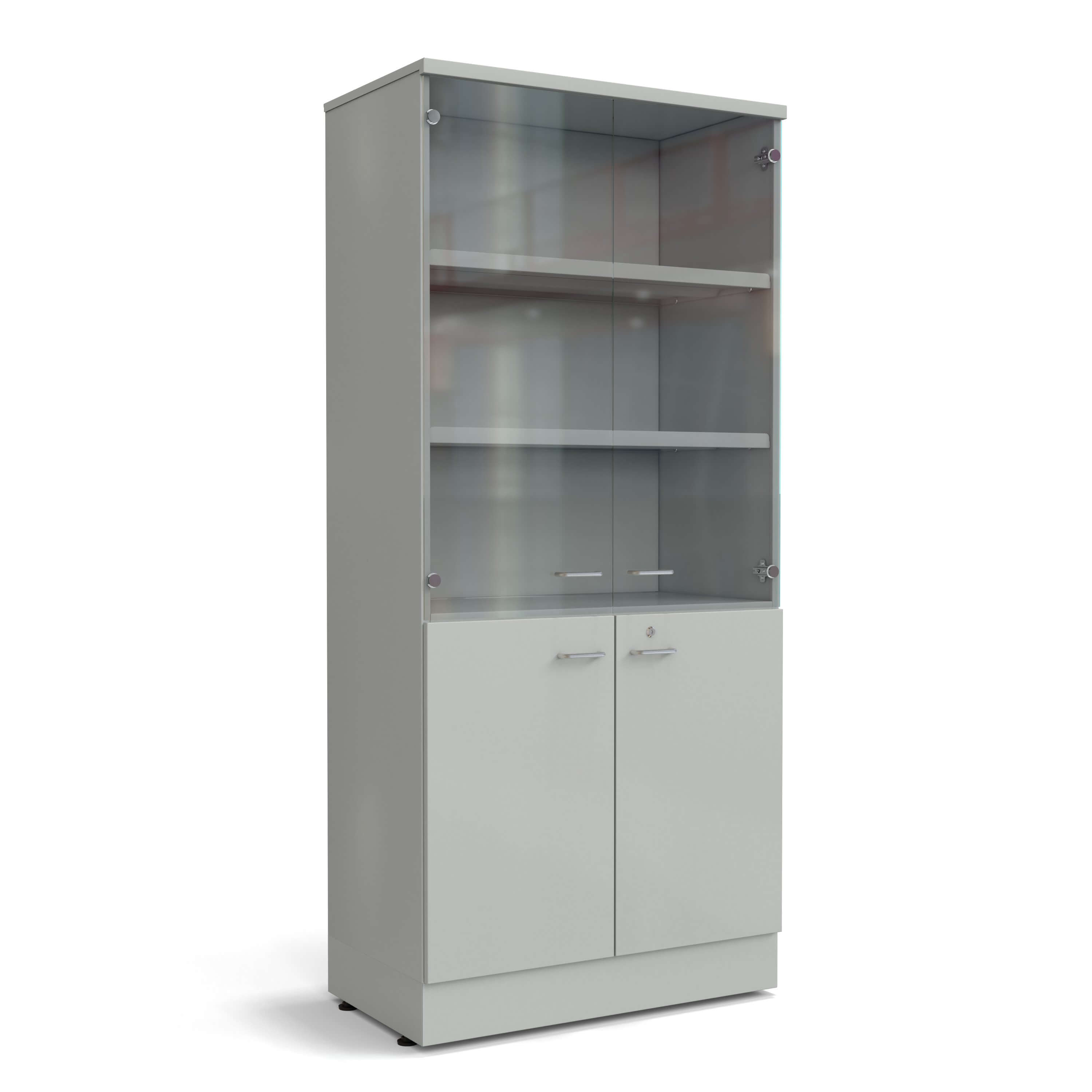 - Верхние дверцы выполнены из закалённого стекла толщиной 4 мм, нижние – металлические (закрываются на замок);