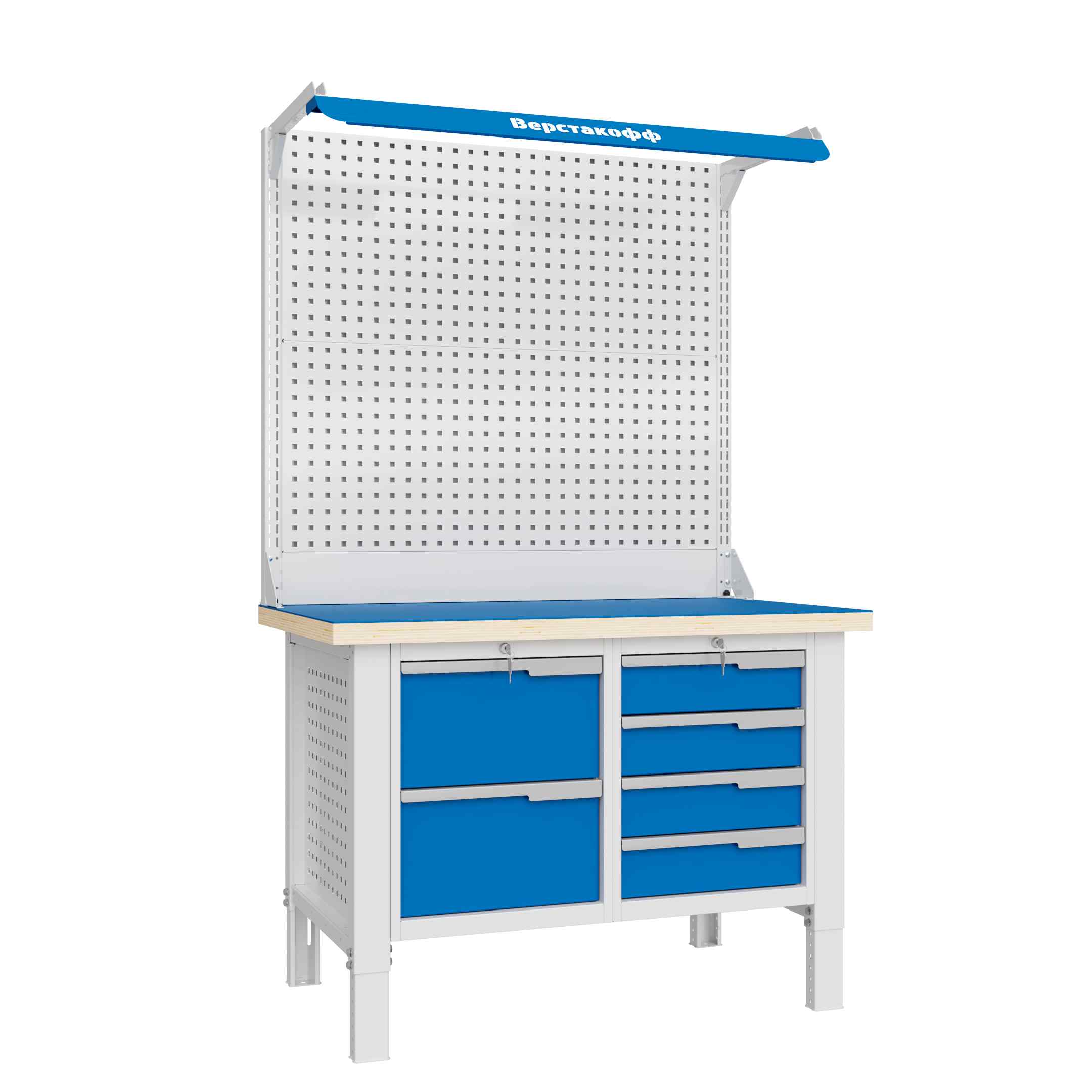 Верстак сборно-разборной конструкции. Соответствует ГОСТ Р 58863-2020. С единой рабочей поверхностью из влагостойкой фанеры марки ФСФ.