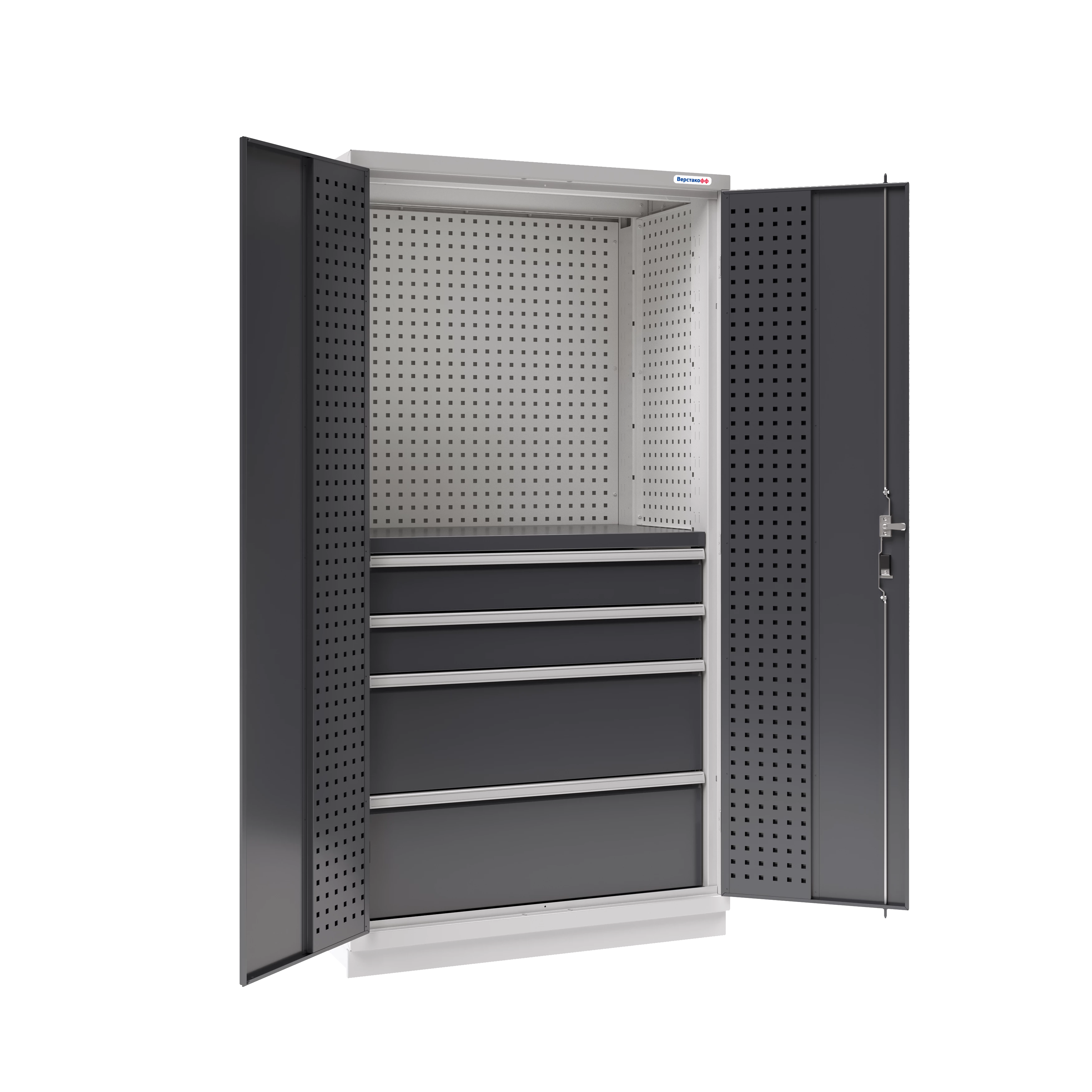 Шкаф изготовлен из листовой стали, имеет ригельный замок обеспечивающий надежное запирание дверей. Все металлические элементы шкафа покрыты полиэфирной порошковой краской, обеспечивающей хорошую износостойкость покрытия и стойкость его к моющим средствам и смазочным веществам. Двери имеют усиливающие профильные рёбра с внутренней части, на рёбрах имеется перфорация в виде квадратных отверстий 12х12 мм и шагом 38 мм. Каждая дверь устанавливается на корпус шкафа при помощи трёх петель с открыванием на 180 гр. Замок двери имеет секретность 2000 комбинаций. С передней стороны выдвижных ящиков установлены декоративные накладки, ручки ящиков имеют накладки, выполненные из алюминиевого сплава с анодированным покрытием, в накладках имеется профильный паз для установки маркировочных табличек. Ящики оснащены шариковыми направляющими полного выдвижения. Шкаф оснащён системой антиопрокидывания, при выдвигании одного ящика система блокирует остальные ящики. Шкаф можно перемещать при помощи вилочного погрузчика или при помощи кран-балки, в верхней части имеются отверстия для установки крепёжных рым болтов.