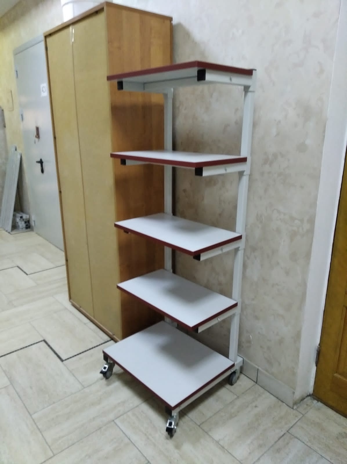Стойка оснащена четырьмя колесными опорами, две из них с механизмом фиксации. Полки толщиной 25 мм изготовлены из ламинированного ДСП. Износостойкое покрытие из промышленного пластика обладает высокой стойкостью к термическим и механическим нагрузкам. Цвет боковой кромки полки фирменный бордовый, под заказ любой другой на Ваш выбор.