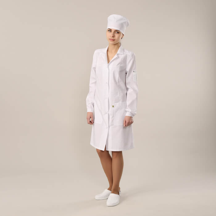 Халаты рекомендуется использовать в комплекте с головным убором и брюками из соответствующей ткани.